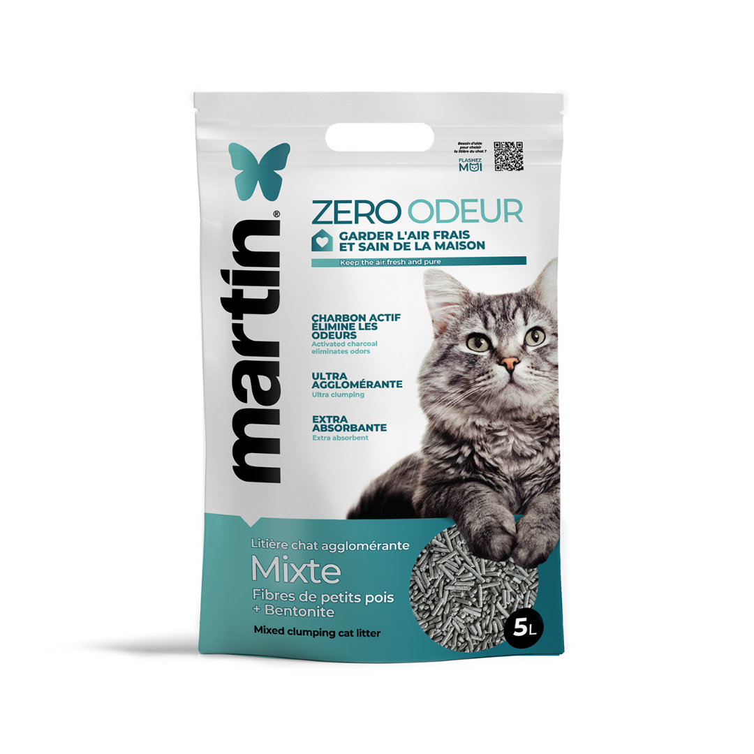 La litière Martin Zéro Odeur est spécialement conçue pour offrir un contrôle exceptionnel des odeurs, tout en garantissant une hygiène parfaite au quotidien. Grâce à son mélange innovant de 70 % de fibres de petit pois avec charbon actif et de 30 % de bentonite naturelle, elle associe le meilleur des deux mondes : performance, sécurité et respect de votre intérieur.
